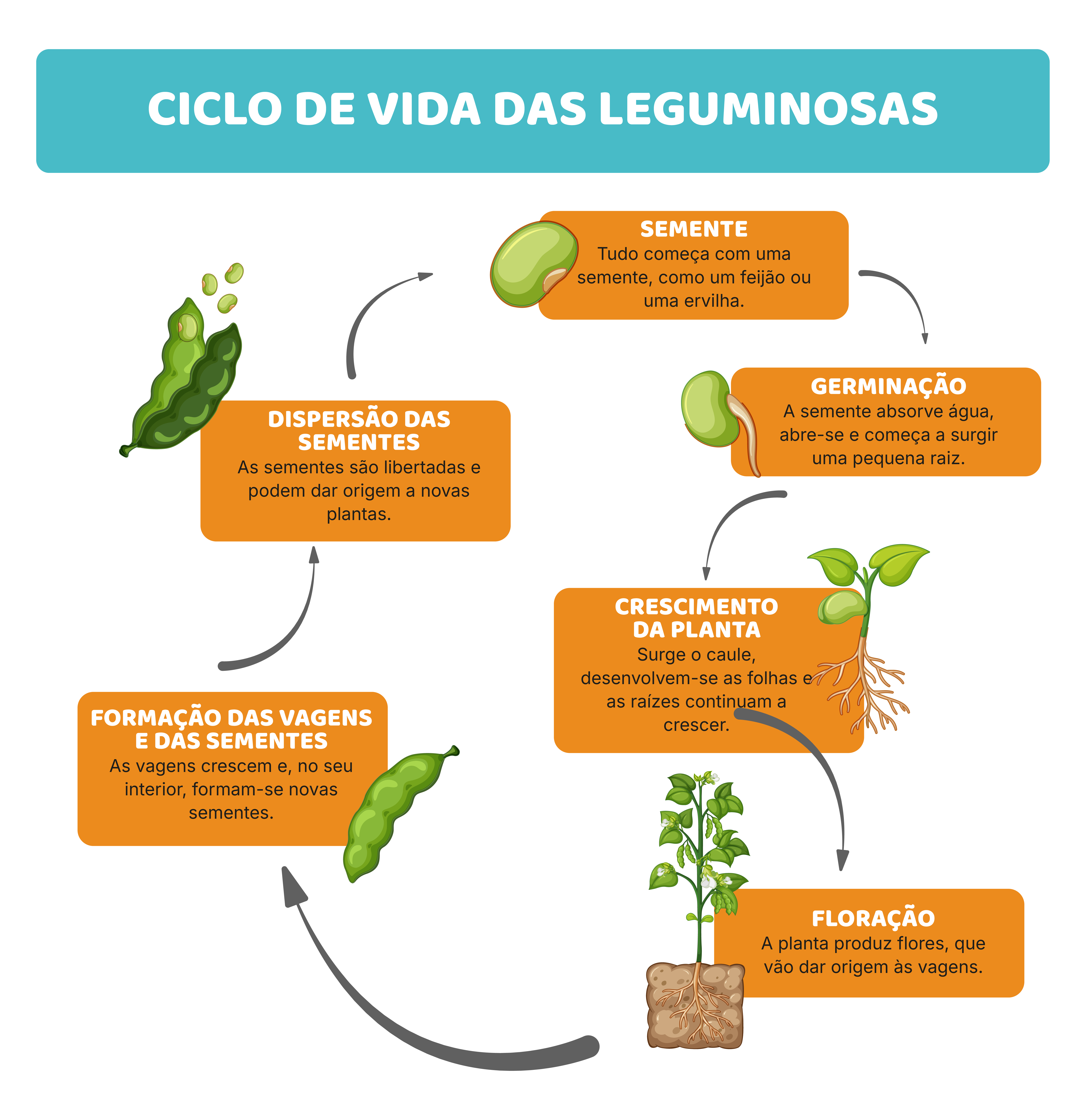 As sementes são colocadas na terra e, com água e sol, transformam-se em pequenas plantas. Nas hastes crescem flores, que depois dão origem às vagens. Dentro das vagens desenvolvem-se as sementes, aquilo que comemos. As plantas de leguminosas têm uma característica especial: conseguem “capturar” azoto do ar através de bactérias nas raízes e enriquecer o solo. É por isso que são tão importantes na agricultura sustentável.