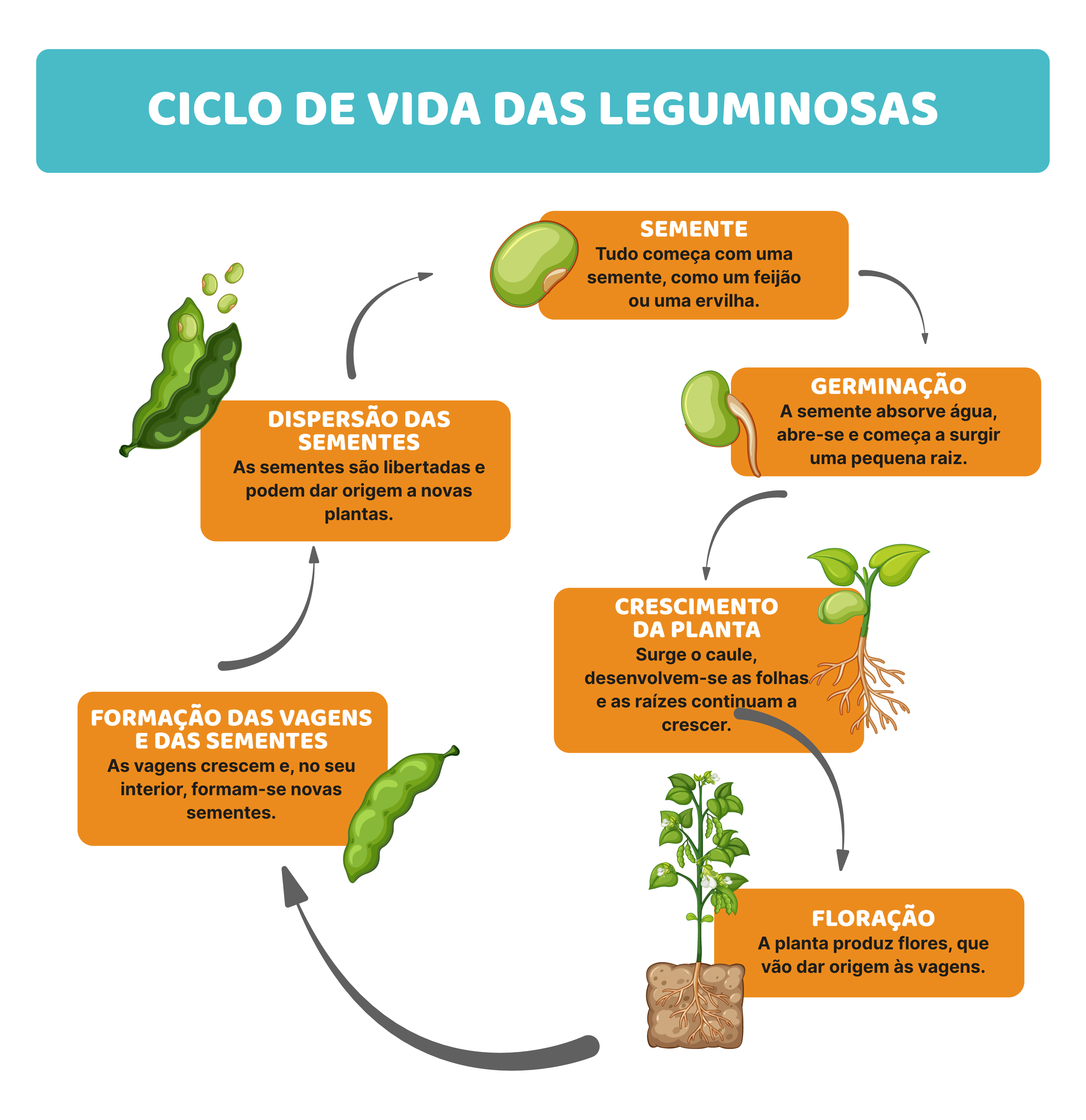 As sementes são colocadas na terra e, com água e sol, transformam-se em pequenas plantas. Nas hastes crescem flores, que depois dão origem às vagens. Dentro das vagens desenvolvem-se as sementes, aquilo que comemos. As plantas de leguminosas têm uma característica especial: conseguem “capturar” azoto do ar através de bactérias nas raízes e enriquecer o solo. É por isso que são tão importantes na agricultura sustentável.